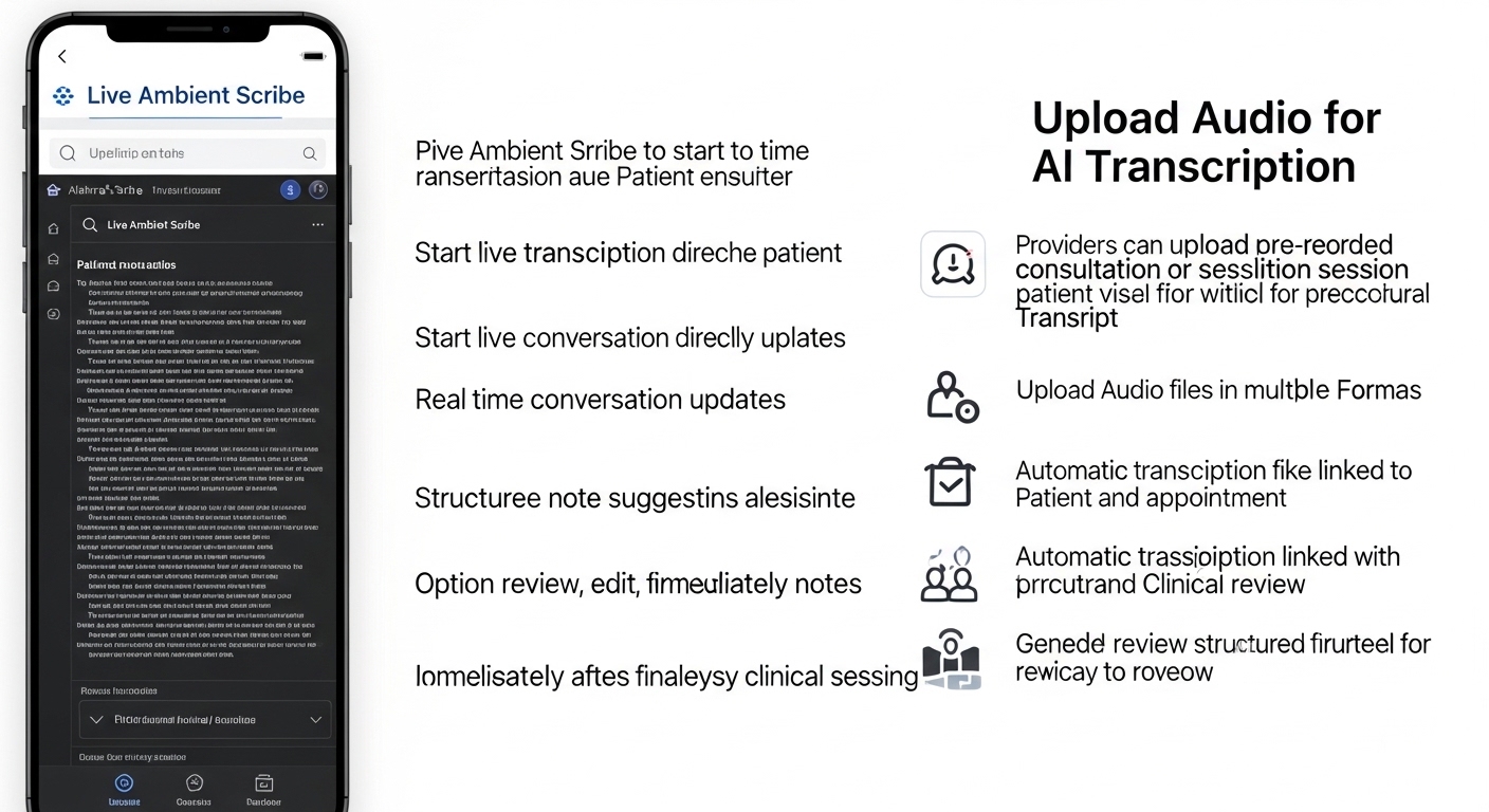 Providers can start a live ambient session during a patient visit. The system listens to the conversation and generates a real-time transcript as the discussion progresses. This allows providers to focus entirely on patient interaction without worrying about manual documentation.