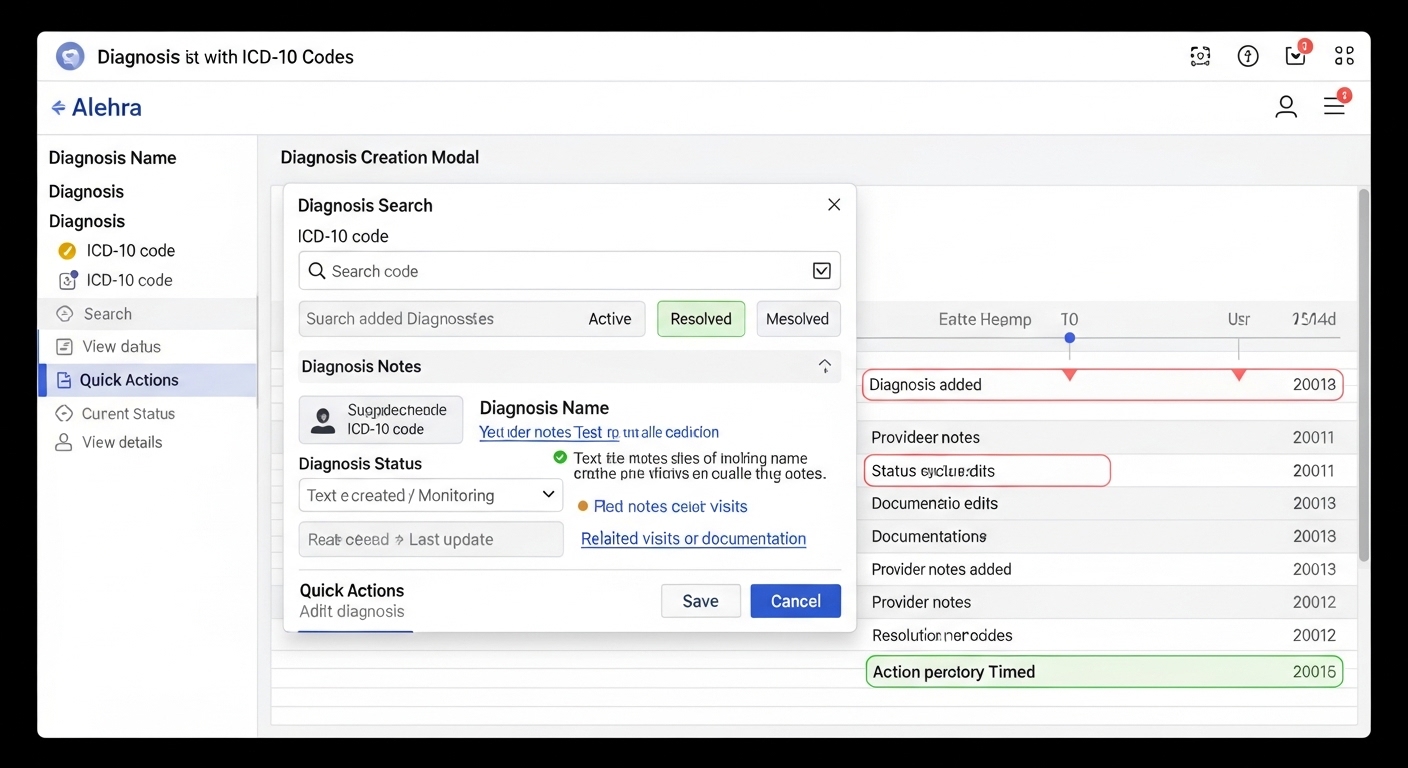 Alehra provides providers with a clear interface to manage patient diagnoses within the clinical record.