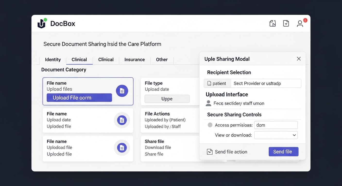 DocBox allows both patients and staff members to securely share files within the Alehra platform. All file transfers remain inside the secure healthcare platform environment.