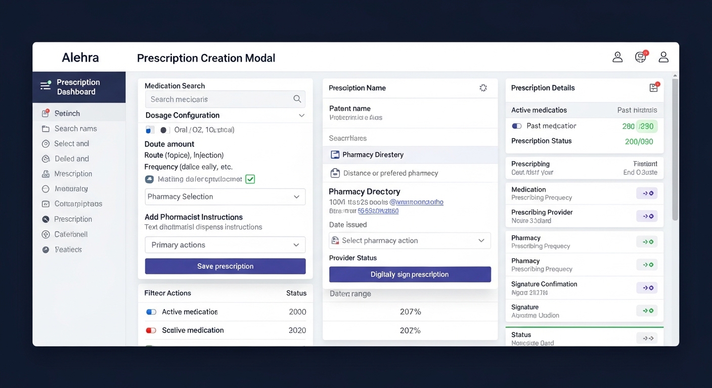 Alehra e-Prescription & Medication Management allows providers to create, review, and manage prescriptions directly within the patient chart. Providers can search medications, select pharmacies, generate prescriptions, and track prescription status — all within a secure clinical workflow designed for modern healthcare practices.